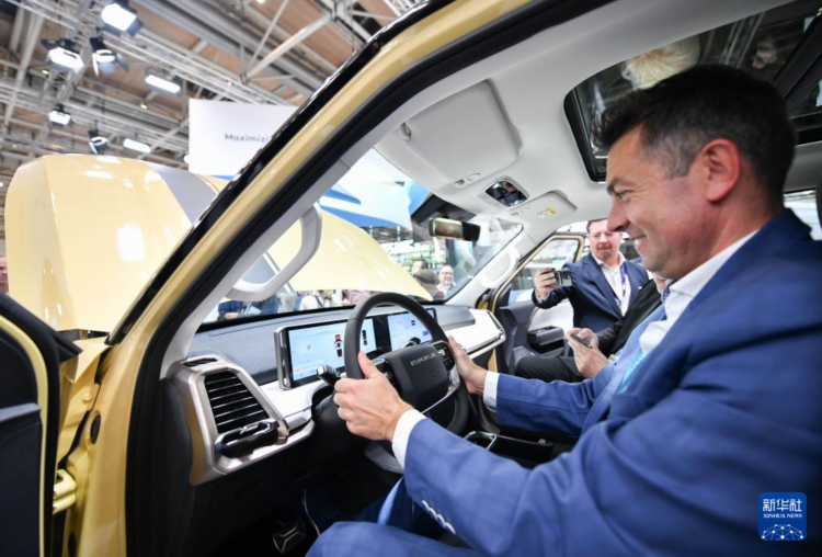 9月16日,在德国汉诺威国际交通运输博览会媒体预展上,一名男子体验上汽大通eTerron 9纯电皮卡车。