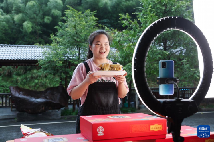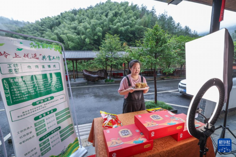 9月19日,岭北镇“岭上优选”共富工坊的工作人员在直播销售岭北盐焗鸡。