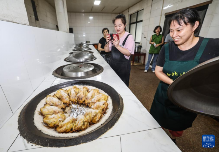 9月19日,在诸暨市岭北镇岭北山庄的厨房里,工作人员查看刚刚烹制完成的盐焗鸡,这也是山庄的主打特色菜。