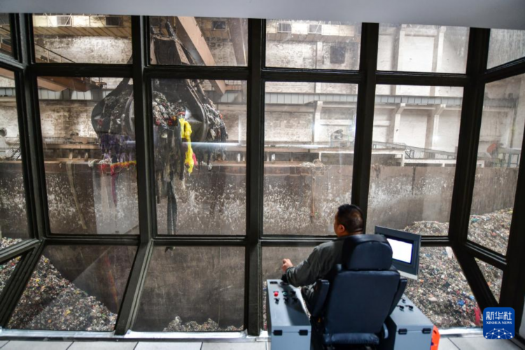 9月19日,在山东启迪济能环保科技有限公司,工作人员在控制室内操作设备吊运垃圾。