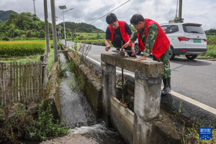 9月19日,浙江省诸暨市赵家镇泉畈村党员志愿者在台风来临前检查沟渠的闸门工作是否正常,根据水流水位及时进行关闸引流。