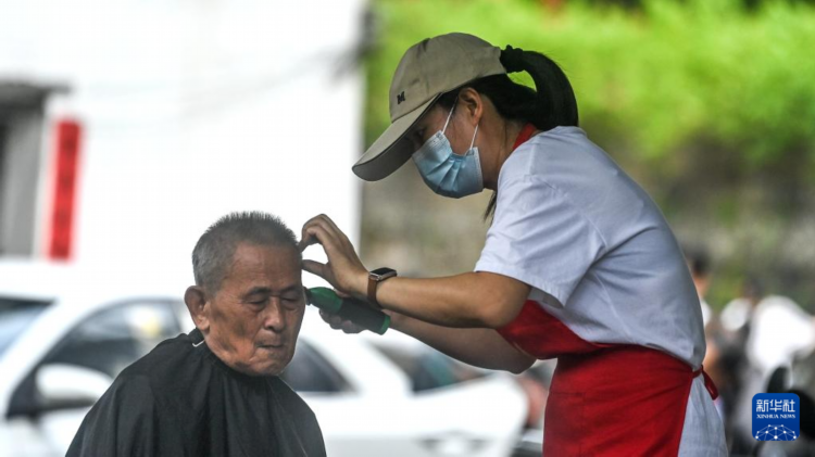 9月22日,青年志愿者(右)在钦州老街给一位老人免费理发。