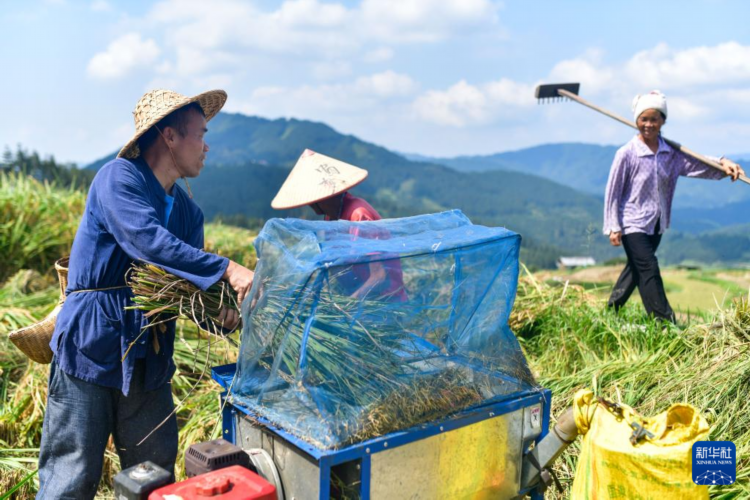 杨正熙(左一)在贵州省黎平县尚重镇洋洞村的梯田里帮助村民收割水稻(9月19日摄)。