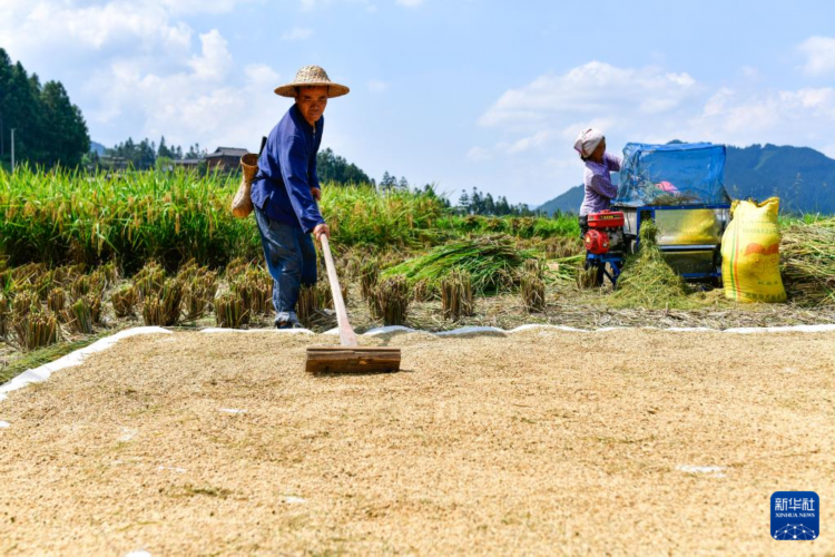 杨正熙(左)在贵州省黎平县尚重镇洋洞村的梯田上帮助村民晾晒稻谷(9月19日摄)。