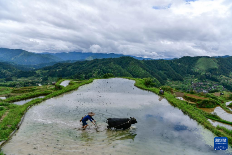 杨正熙在贵州省黎平县尚重镇洋洞村的梯田上帮助村民耕田(5月19日摄)。