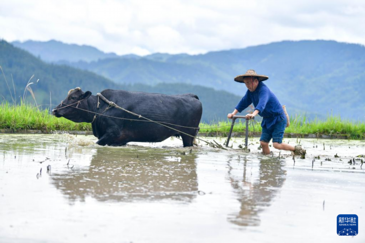 杨正熙在贵州省黎平县尚重镇洋洞村的梯田上帮助村民耕田(5月19日摄)。