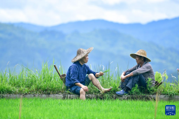 在贵州省黎平县尚重镇洋洞村,杨正熙(左)向村民介绍有机水稻种植的好处(5月19日摄)。