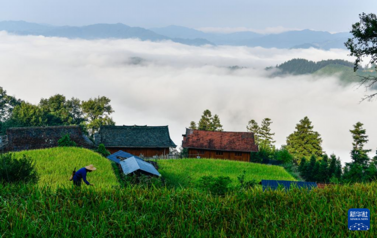 杨正熙在贵州省黎平县尚重镇洋洞村的梯田上查看水稻成熟情况(9月19日摄)。