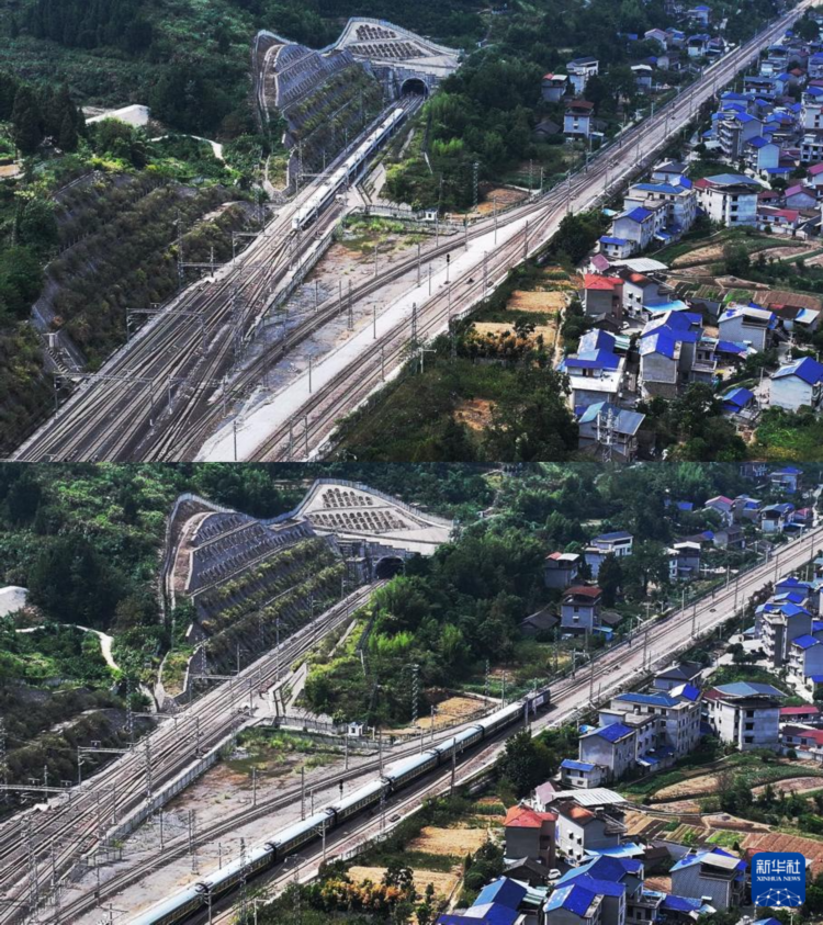 这是一张拼版照片:上图为9月19日,一列高铁列车从禾家村站前的渝厦高铁黔常段隧道中驶出(无人机照片);下图为9月19日,普快列车从禾家村站驶出(无人机照片)。