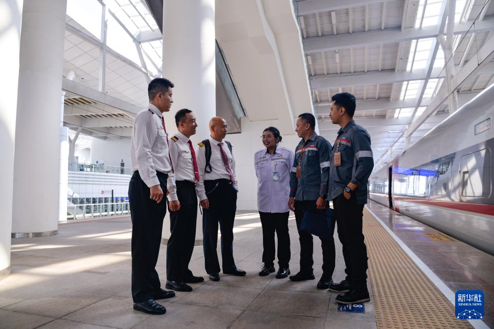 9月12日,在印度尼西亚万隆德卡鲁尔站站台,张跃(左一)和同事对高铁驾驶操纵学习情况进行总结分析。