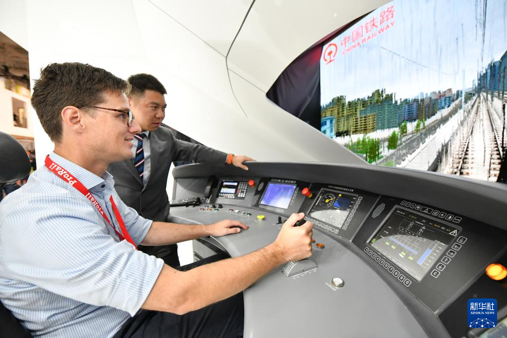 9月24日,在德国柏林轨道交通展中国国家铁路集团有限公司展区,一名男子体验复兴号动车组模拟驾驶。