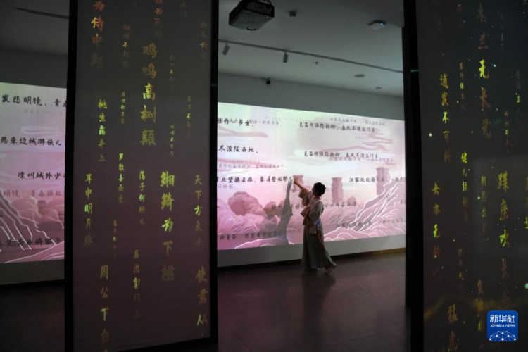 7月9日,讲解员在武威汉唐天马城凉州词馆介绍《凉州词》。