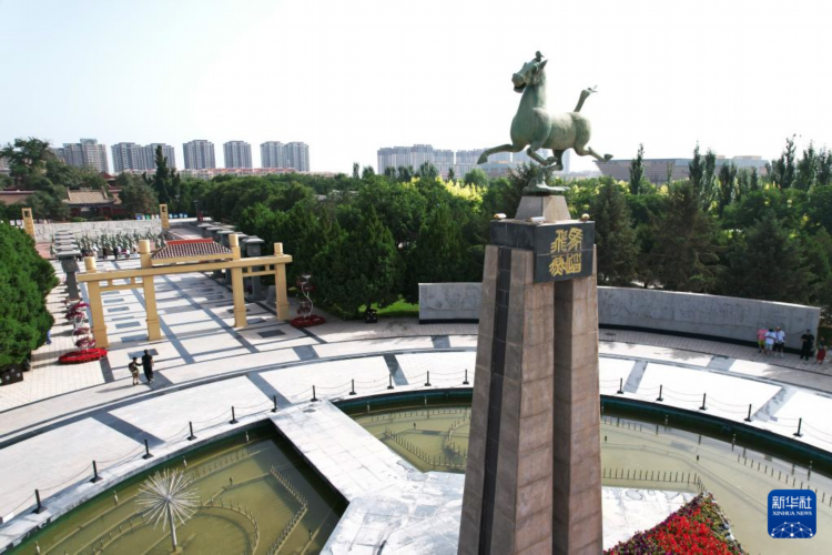 7月9日拍摄的武威雷台汉墓景区中的铜奔马雕塑(无人机照片)。