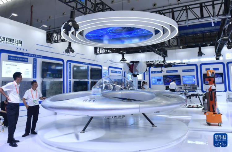 9月26日在第21届中国—东盟博览会先进技术展区拍摄的智航载人飞碟飞行器。