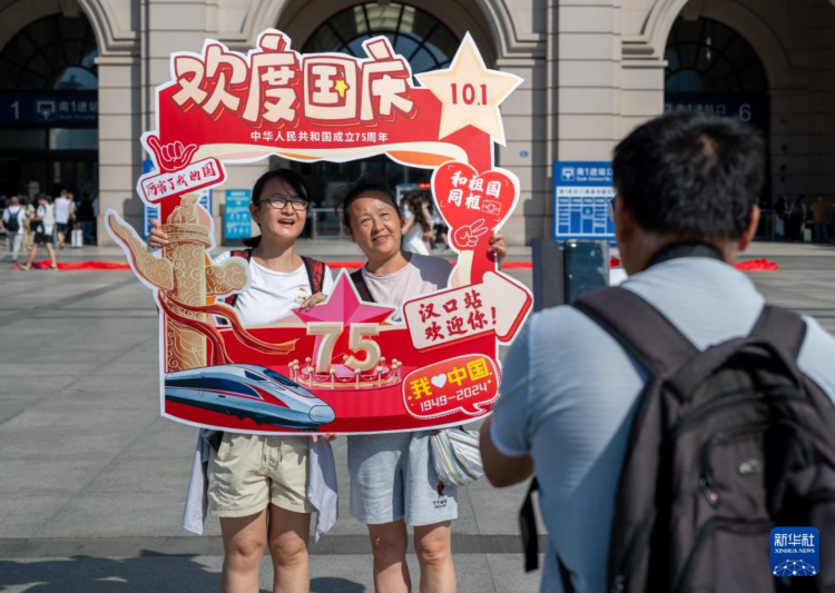 9月29日,中国铁路武汉局集团有限公司在汉口火车站广场开展迎国庆快闪活动,旅客合影留念。
