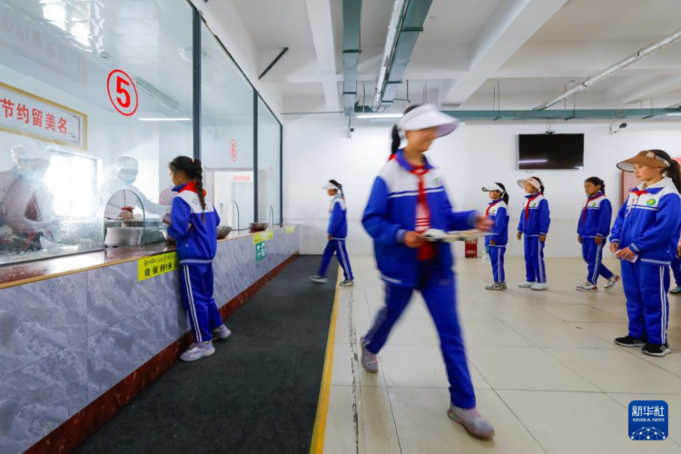 9月27日,道孚县城关第一完全小学的寄宿制学生在食堂领取免费午餐。
