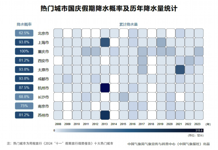 从历年降水概率和降水量统计看,北京、长沙、南京等地较为适宜出行。
