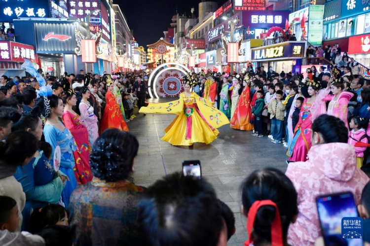 10月6日,游客在宁夏银川市兴庆区步行街文旅夜市观看现场演出。