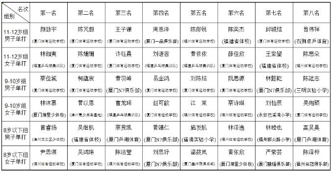 经过激烈的角逐,最终颜劭宇获得11-12岁组男子单打冠军,林珈夷获得11-12岁组女子单打冠军,蔡佳城获得9-10岁组男子单打冠军,林沐慕获得9-10岁组女子单打冠军,曾睿扬获得8岁以下组男子单打冠军,尹思淇获得8岁以下组女子单打冠军,具体成绩如下↓↓↓