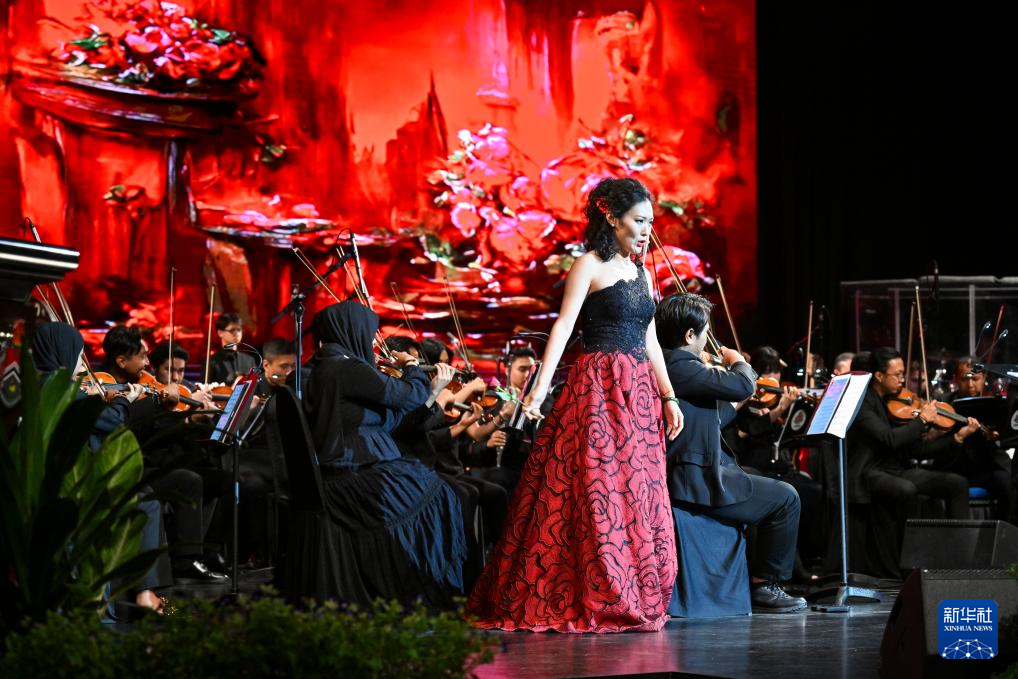 庆祝马中建交50周年声乐音乐会在吉隆坡举行 9月26日,马来西亚吉隆坡,来自中国中央歌剧院的歌手在“歌颂友谊·唱响未来”马中建交50周年声乐音乐会上演出。 “歌颂友谊·唱响未来”马中建交50周年声乐音乐会26日晚在马来西亚首都吉隆坡市政厅音乐厅举行,约500位来自马中两国各界的嘉宾现场观看演出。 新华社记者 程一恒 摄