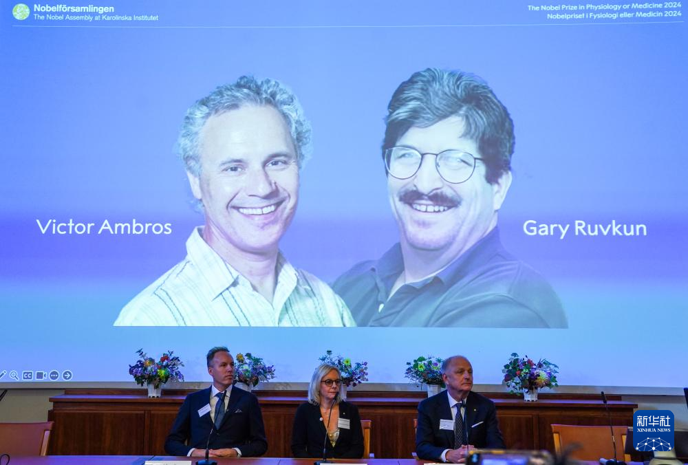 两名科学家获2024年诺贝尔生理学或医学奖 10月7日,在瑞典斯德哥尔摩举行的2024年诺贝尔生理学或医学奖公布现场,屏幕显示奖项得主美国科学家维克托·安布罗斯(左)和加里·鲁夫坎的照片。 瑞典卡罗琳医学院7日宣布,美国科学家维克托·安布罗斯和加里·鲁夫坎因发现微小核糖核酸及其在转录后基因调控中的作用而获得2024年诺贝尔生理学或医学奖。 新华社记者 彭子洋 摄