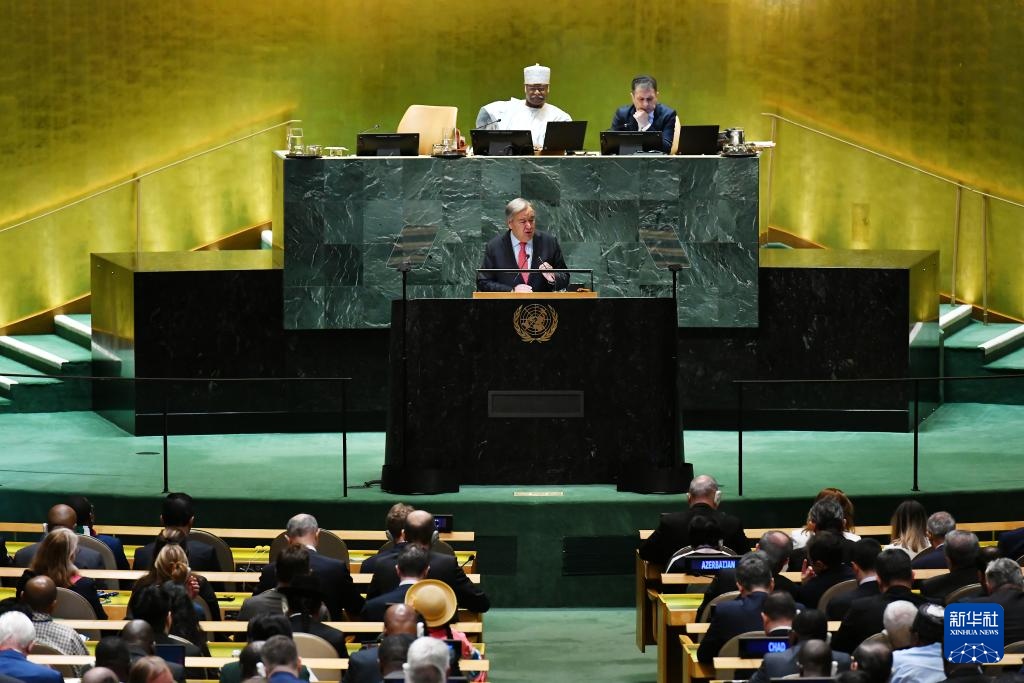 第79届联合国大会一般性辩论开幕 9月24日,在位于纽约的联合国总部,联合国秘书长古特雷斯(中)在第79届联合国大会一般性辩论开幕式上致辞。 第79届联合国大会一般性辩论24日在纽约联合国总部拉开帷幕。多国国家元首、政府首脑和高级别代表将就应对不断恶化的地缘冲突、推进可持续发展、应对全球性危机等国际社会共同关注的重大问题,表达各自国家立场并提出解决方案。 新华社记者 李睿 摄