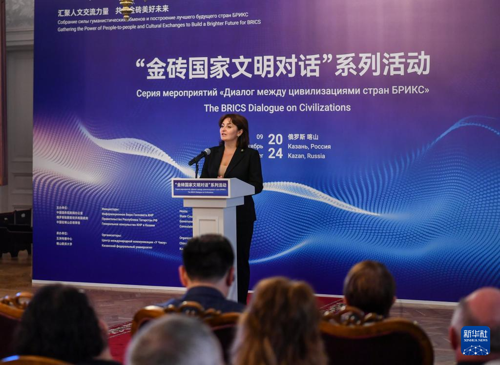 “金砖国家文明对话”系列活动在俄罗斯喀山举行 9月24日,在俄罗斯喀山,俄罗斯联邦鞑靼斯坦共和国副总理列伊拉·法兹列耶娃在活动中致辞。 “金砖国家文明对话”系列活动24日在俄罗斯喀山举行,来自中国、俄罗斯、巴西、印度、南非、伊朗等金砖国家的相关机构、各领域专家学者及青年代表等300多人参加。 新华社记者 曹阳 摄