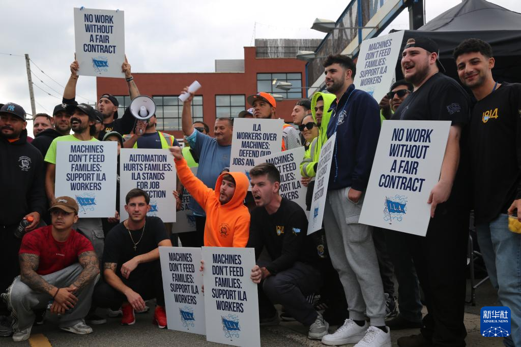 美国港口工人罢工 10月1日,工人在美国纽约市布鲁克林雷德胡克集装箱码头参加罢工。 10月1日,美国东海岸和墨西哥湾沿岸30多个码头的数万名工人举行罢工,要求涨薪,反对港口机械设备自动化。 新华社记者 刘亚南 摄