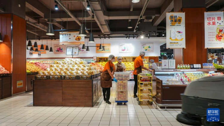 2024年8月22日,在许昌胖东来时代广场店,店员在做开业前的准备工作。新华社记者 刘振坤 摄
