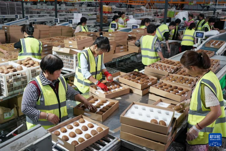 周至县一家猕猴桃生产企业的工人在对猕猴桃进行质检和包装(9月28日摄)。