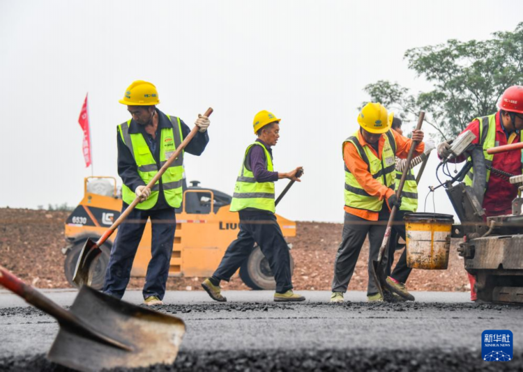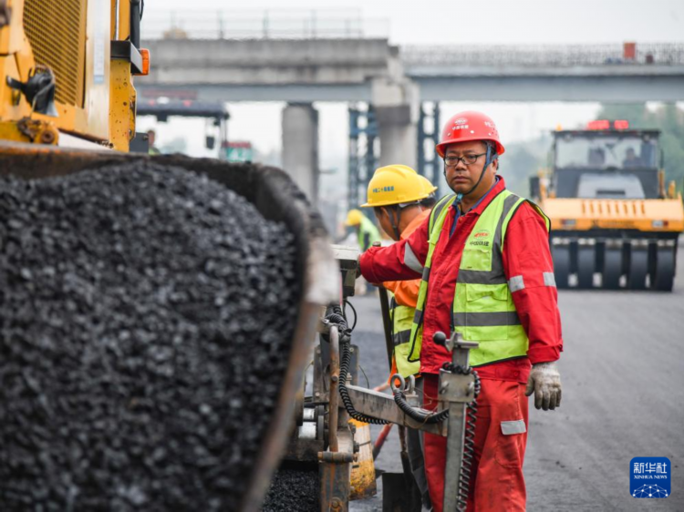 10月8日,在位于四川省成都市金堂县的成南高速扩容工程淮口互通,中铁二十局的工人进行路面施工。