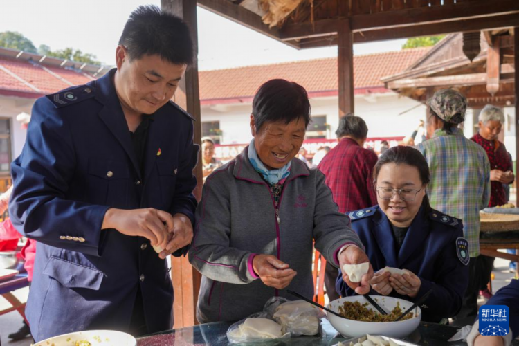 10月10日,博山区公交公司志愿者在池上镇池埠村长者食堂和老人一起包饺子。