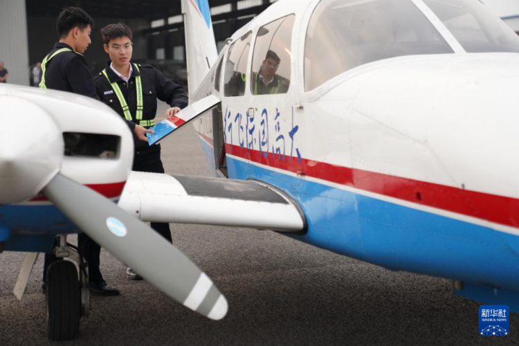 10月9日,在滨州市大高通用机场,飞行学员在飞行训练前检查飞机状态。