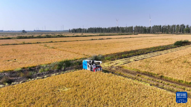 10月11日,在天津市宁河区东赵庄村,农民驾驶收割机收割水稻(无人机照片)。