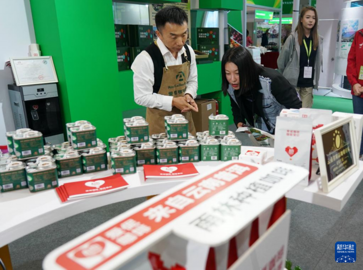 10月11日,参观者在世界农业科技博览会现场了解来自云南的咖啡。