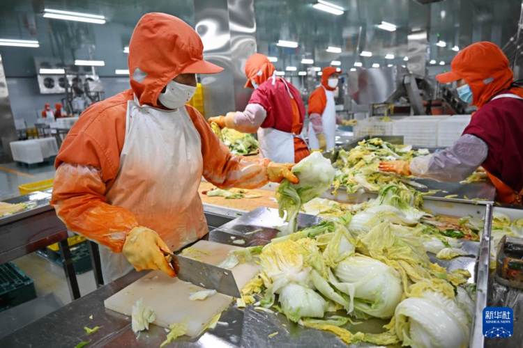 10月11日,青岛一家食品企业职工在加工韩式泡菜。