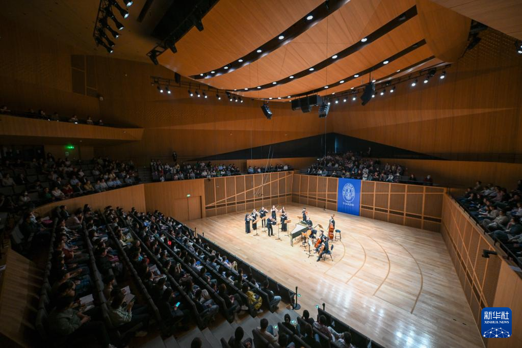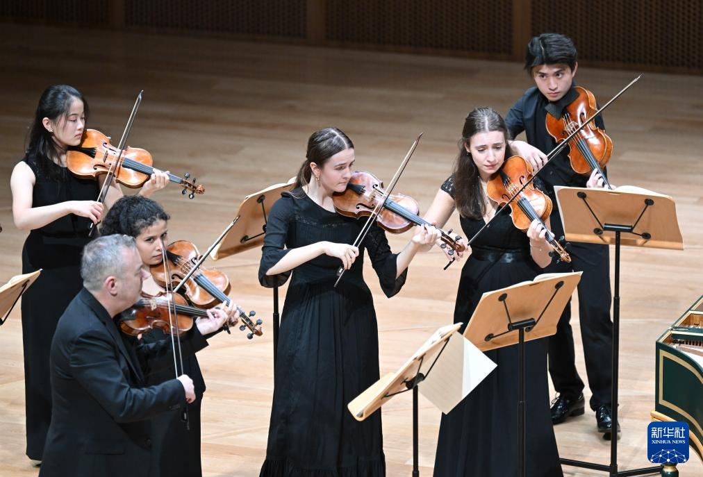 10月13日,美国茱莉亚415古乐团在天津茱莉亚学院演出。 10月13日,美国茱莉亚415古乐团的14名师生在天津茱莉亚学院举行音乐会“一场音乐的盛宴:巴洛克协奏曲与舞曲”,这是美国茱莉亚415古乐团首次来华举行音乐演出。乐团成员还将在天津茱莉亚学院开展驻院讲学,举办工作坊、研讨会、联合排练等学术交流活动。未来一周,该乐团师生还将在北京、南京、苏州、上海4个城市开启巡演演出。 新华社记者 孙凡越 摄
