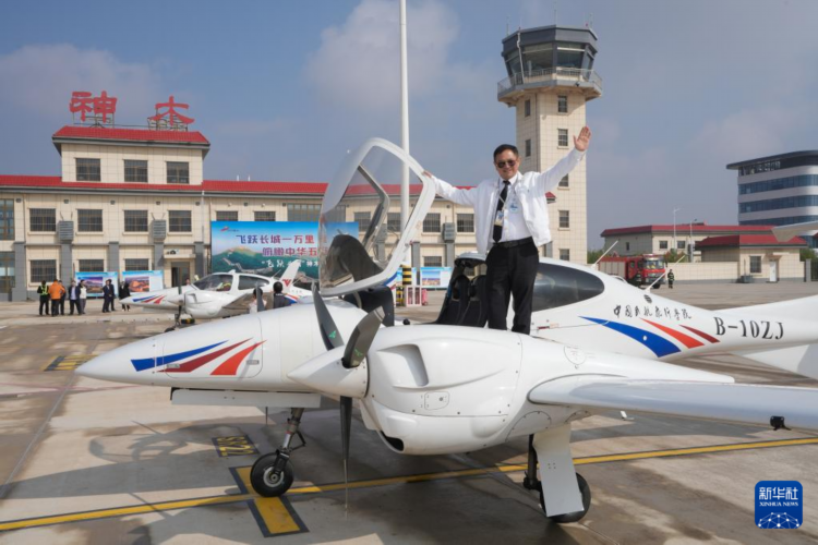 10月13日,在陕西神木机场,参与“飞越长城”航空文化活动的飞行员张博登机准备起飞。
