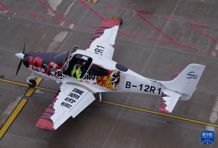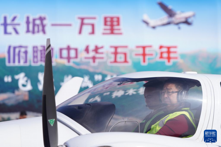 10月13日,在陕西神木机场,参与“飞越长城”航空文化活动的飞行员张博登机准备起飞。