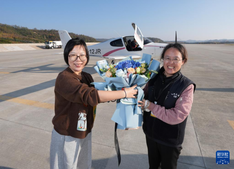 10月13日,在陕西延安机场,工作人员迎接驾机抵达的女飞行员吴运娟(右)。