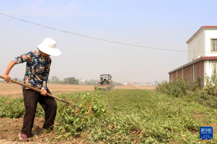 10月11日,在驻马店市正阳县熊寨镇王大塘村,村民在整理收获的花生,准备晾晒。