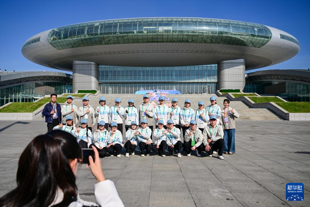 10月13日,在新疆国际会展中心,志愿者在会场外合影留念。