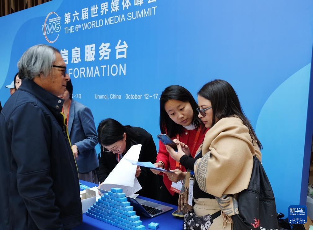 10月13日,在新疆乌鲁木齐,与会外宾在世界媒体峰会信息服务台咨询。