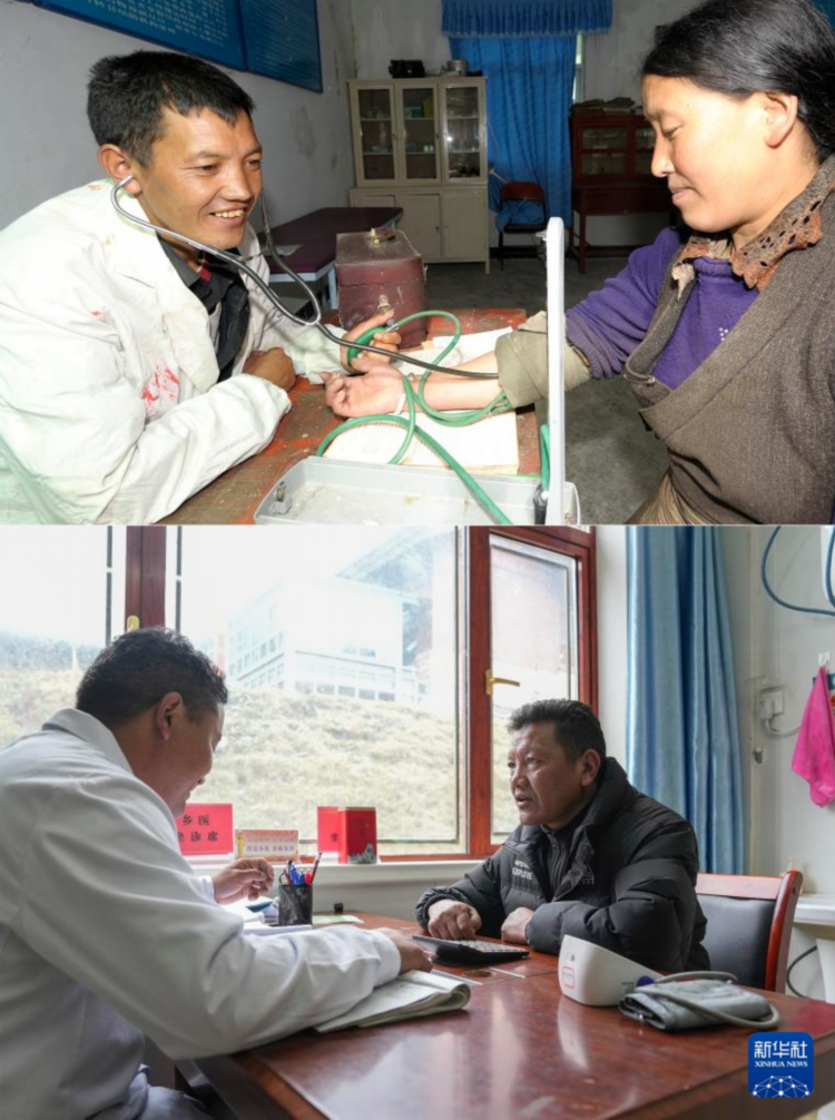 拼版照片:上图为玉麦乡卫生员扎西罗布(左)给乡民检查血压(新华社记者普布扎西摄,2009年9月9日摄);下图为在西藏隆子县中心医院玉麦乡卫生分院,扎西罗布(右)与医生旦增曲珍交流(新华社记者丁汀摄,2024年10月15日摄)。扎西罗布1996年来到玉麦乡工作,并在此成家。