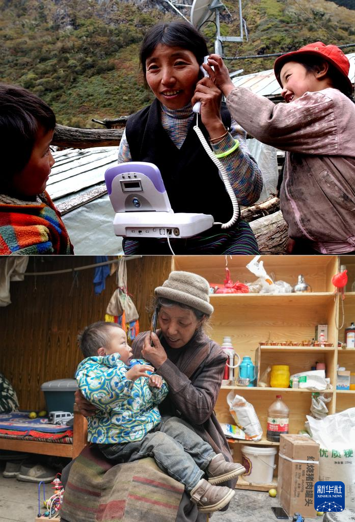 拼版照片:上图为2003年10月26日拍摄的卓嘎(中)与孩子们一起从家乡给在山外的朋友打电话(新华社记者索朗罗布摄);下图为2024年10月15日拍摄的卓嘎抱着外孙通过微信语音与女儿通话(新华社记者丁汀摄)。
