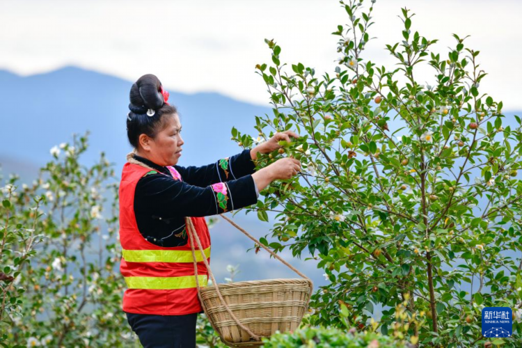 10月15日,工人(右)和村民在龙里县颐光山林油茶生态园采摘油茶果。