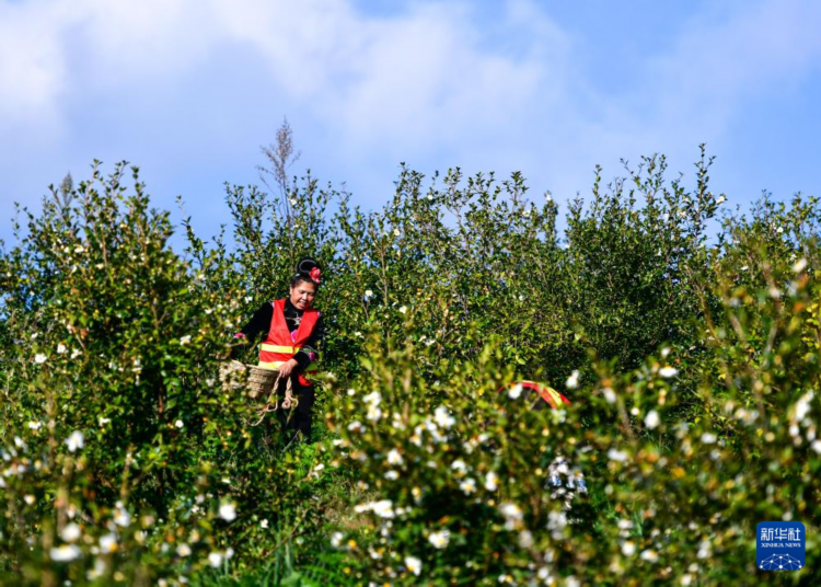 10月15日,村民在龙里县颐光山林油茶生态园采摘油茶果。