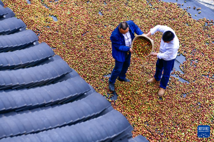 10月15日,村民在龙里县颐光山林油茶生态园晾晒油茶果。