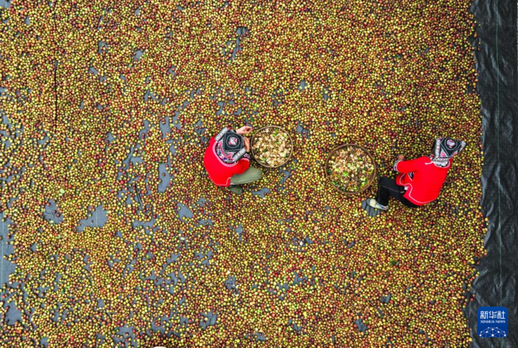10月15日,村民在龙里县颐光山林油茶生态园晾晒油茶果(无人机照片)。