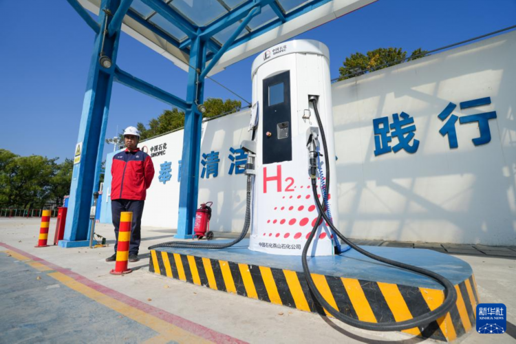10月15日,在中国石化燕山石化公司的加氢站,一名工作人员在为一辆氢能叉车加氢气。